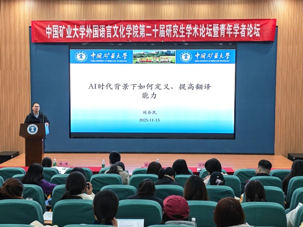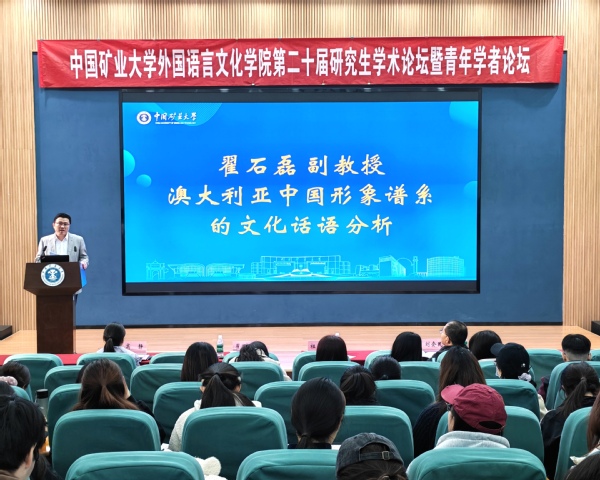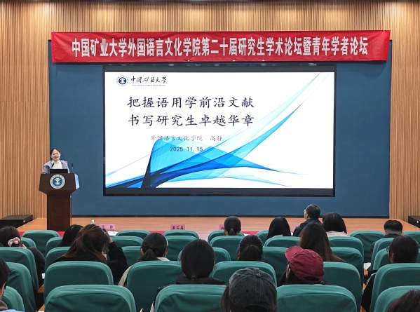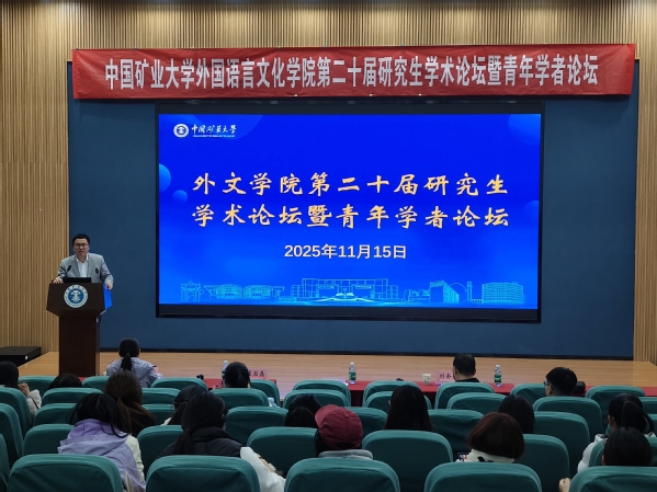 11月15日上午,中国矿业大学外国语言文化学院第二十届研究生学术论坛暨青年学者论坛在文B102报告厅举行。本次论坛由中国矿业大学党委研究生工作部与外文学院联合主办,外文学院研究生会承办。院长祖大庆、副院长翟石磊、刘会民副教授以及高静博士出席论坛,学院全体研究生及部分本科生参与交流。本次论坛由副院长翟石磊与研究生张英、王雨时共同主持。