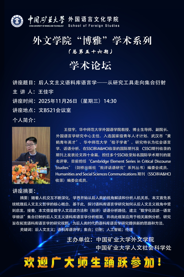 外文学院“博雅”学术系列(总第五十六期)学术论坛 后人文主义语料库语言学 ——从研究工具走向集合衍射