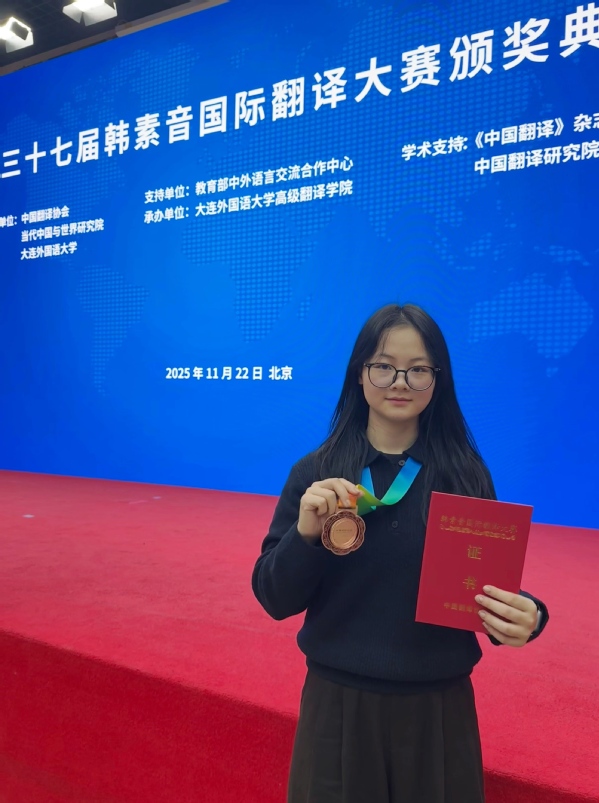 近日,第三十七届韩素音国际翻译大赛获奖名单揭晓,我院2024级英语笔译专业研究生章榕同学凭借扎实的专业能力脱颖而出,荣获英译汉三等奖,并作为学院代表参加本次翻译大赛颁奖典礼。