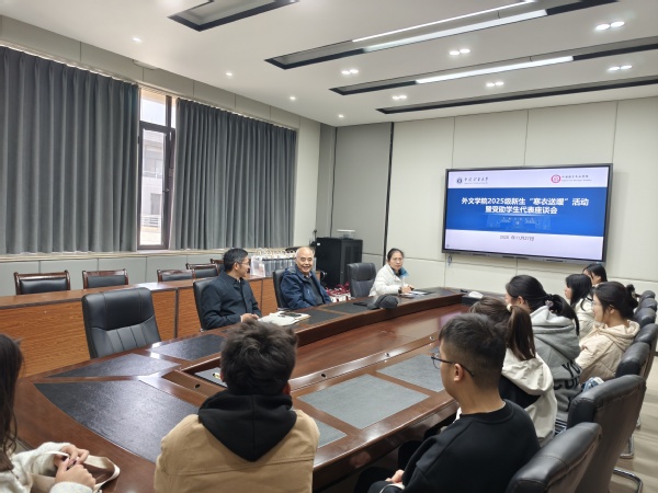 11月27日上午,外文学院在B521会议室举行2025级新生“寒衣送暖”暨受助学生代表座谈会。院关工委常务副主任李灏、院党委副书记朱正中,以及10名受助学生代表参加活动。活动由辅导员付尚主持。