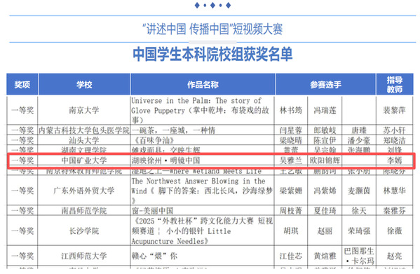 近日,第八届“外教社杯”全国高校学生跨文化能力大赛“讲述中国·传播中国”短视频大赛全国赛评选结果正式公布。我院英语专业2023级学生吴雅兰与力学与土木工程学院2025级学生欧阳锦辉在李嫣老师指导下,创作拍摄英语短视频作品《湖映徐州·明镜中国》,荣获全国赛一等奖。该团队今年10月份在第四届外教社杯“用外语讲好家乡故事”演讲比赛斩获江苏省赛特等奖。