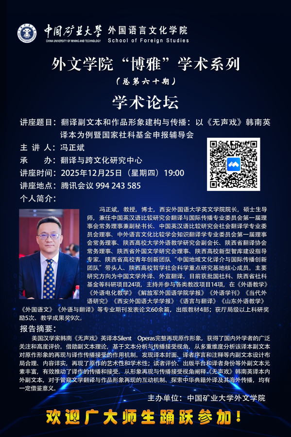 外文学院“博雅”学术系列 (总第六十期)学术论坛 翻译副文本和作品形象建构与传播:以《无声戏》韩南英译本为例暨国家社科基金申报辅导会