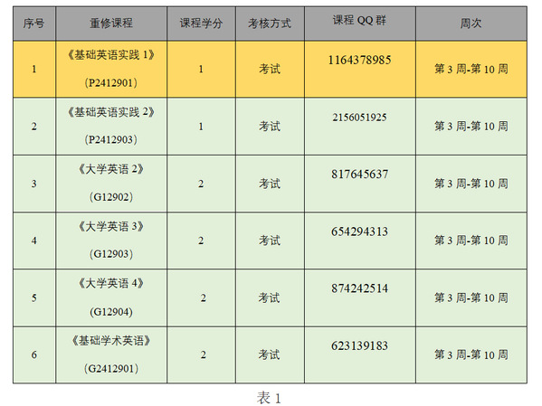 三、教务系统选课成功的学生请即刻加入课程QQ群(见表1)。在QQ群查阅课程说明和要求,领取学习任务(请选课同学密切关注各重修班级群消息),并按照时间要求完成学习任务。