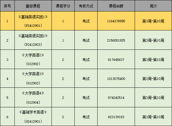 三、教务系统选课成功的学生请即刻加入课程QQ群(见表1)。在QQ群查阅课程说明和要求,领取学习任务(请选课同学密切关注各重修班级群消息),并按照时间要求完成学习任务。