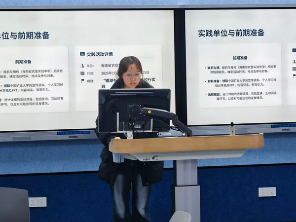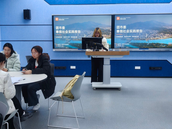 参加实践的同学依次上台,通过PPT讲解与视频素材,全方位展示了丰富多彩的寒假实践生活。在“返家乡”社会实践与科创实践中,同学们立足专业、深入社会:有的走进游戏公司调研,运用外语专业优势,探索游戏海外传播与本土化路径;有的投身政府相关部门实习,在实践中践行责任与担当;有的在景区担任志愿者,以实际行动服务游客、奉献社会;还有的聚焦家乡文旅发展,对比分析景区AI翻译与官方人工译文,探索数字技术赋能文旅对外传播的新方式,助力讲好中国故事。参加“镜湖有约”优秀学子母校行活动的同学则回到了高中母校,与学弟学妹分享学习心得、大学生活与成长感悟,用真诚与热情传递榜样力量。