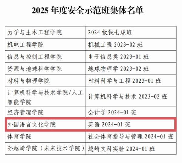 近日,学校公布了《关于表彰2025年度安全示范班集体的决定》文件,我院英语2024-1班荣获“中国矿业大学2025年度安全示范班集体”荣誉称号。这是学院连续第三年在校级安全示范班集体评选中获此殊荣,充分体现了学院在班级安全建设方面的持续深耕与扎实成效。
