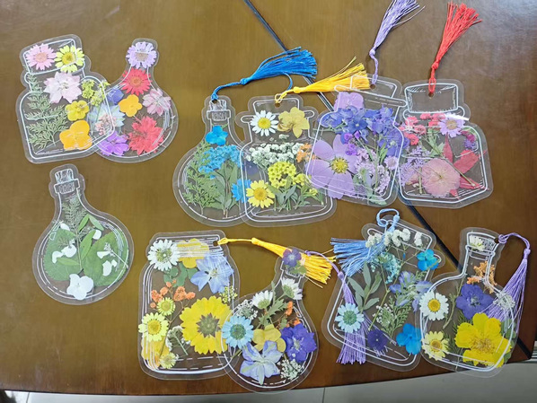 活动现场,主办方提前准备了干花、胶水、封膜等材料。同学们领取材料后,自主构思、动手制作,将不同颜色与形态的花瓣进行搭配组合,封入书签。现场气氛轻松而专注,大家不时交流创意,分享制作技巧。本次活动紧扣春季时令,融合自然审美与阅读文化,契合社区大学生缓解学业压力、寻求创意表达与慢生活体验的心理需求。同时,干花的再利用体现了绿色环保理念,引导学生珍惜资源、践行可持续发展。