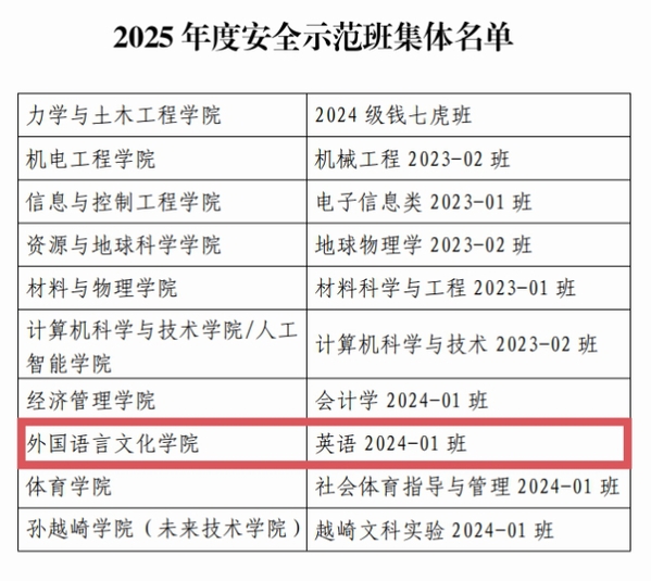 近日,学校公布了《关于表彰2025年度安全示范班集体的决定》,我院英语2024-1班荣获“2025年度安...